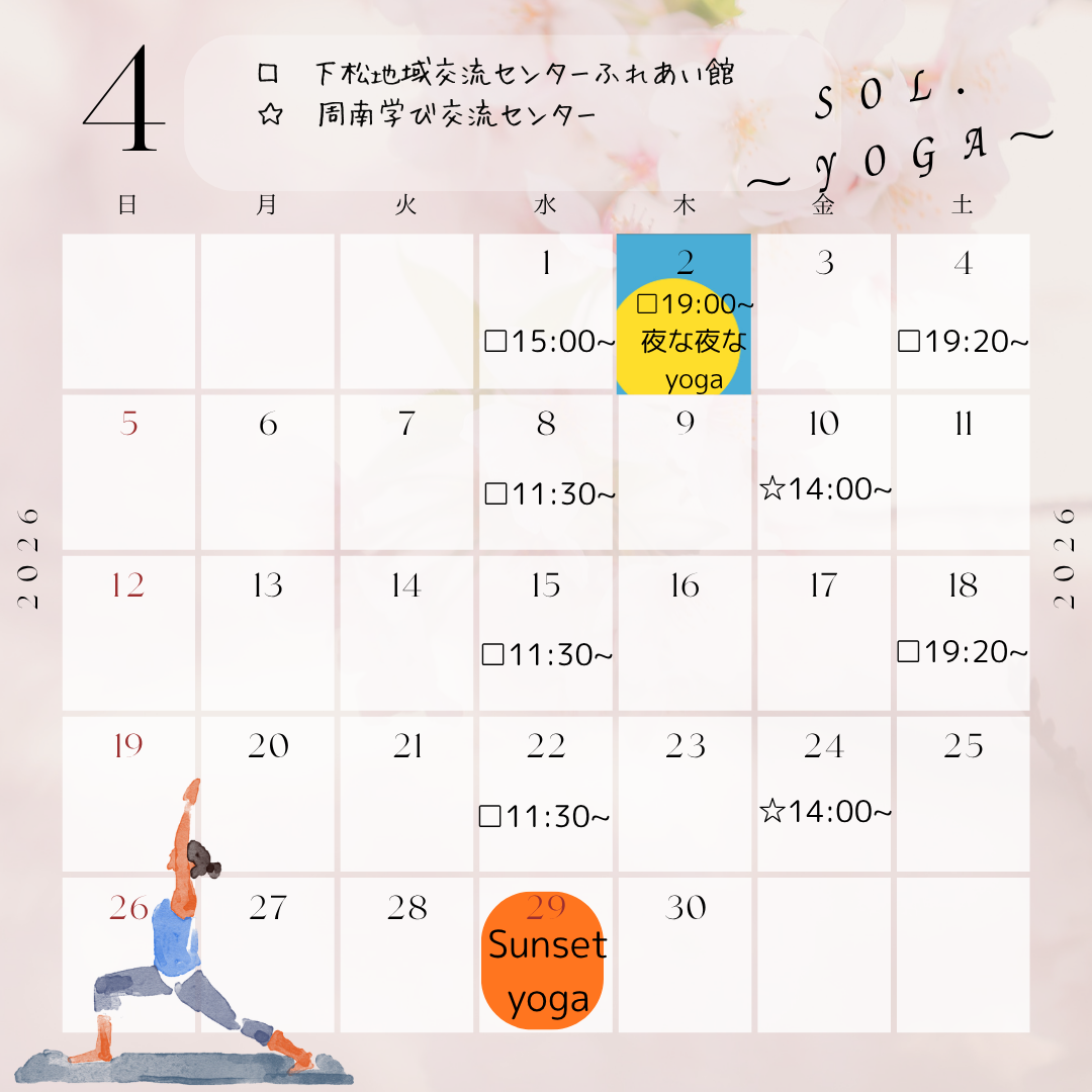- 新しい年度を迎えて、SOL.~yoga~<div>新しいレッスンやメニューを始める運びとなりました☆彡<div>☆夜ヨガ</div><div>第1、第3土曜日</div><div>場所:下松地域交流センター和室</div><div>時間:19:20~</div><div>料金:月謝:4,000円単発2,500円</div></div><div><br></div><div>☆毎年4/29のサンセットヨガ</div><div>場所:下松市笠戸島はなぐり海水浴</div><div>時間:18:00~</div><div>料金:1,100円</div><div><br></div><div>☆魂覚醒カウンセリング</div><div>・カラダや心のカウンセリング</div><div>・恋愛に関するカウンセリング</div><div>・唯一無二のあなたに合った真の整え方 など</div><div>場所:オンライン(zoom)or SOL.~yoga~サロン</div><div>時間:60分程度</div><div>料金:6,800円</div><div><br></div><div>ご予約は公式ラインよりお申し込みください</div><div><br></div><div>心地よく生きるためにあなたのことを応援しています(^^)/</div><div>今月もよろしくお願いします</div>