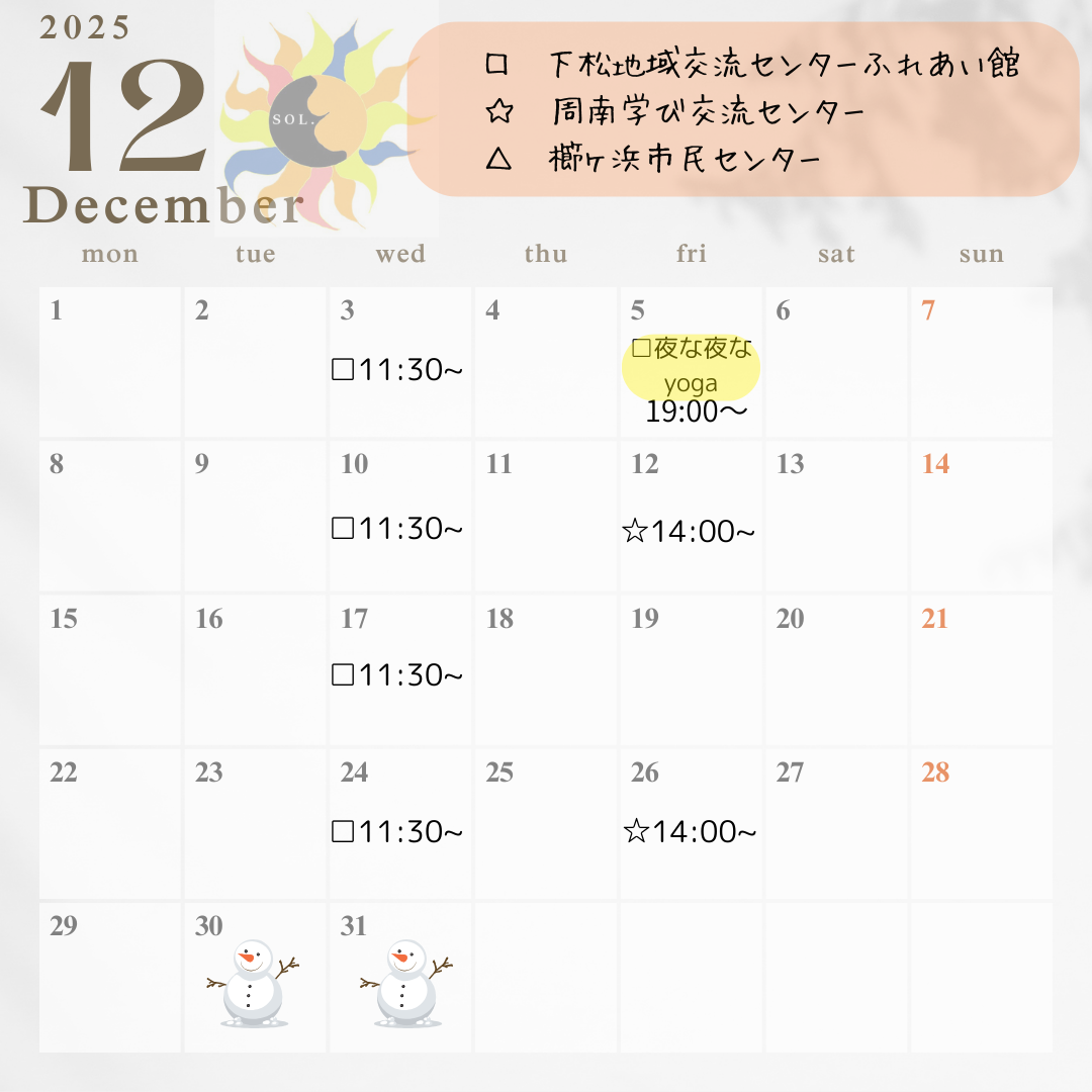 - 2025年もあっという間に最後の月になりました☺<div><br></div><div>12月年末年始も準備でばたばたと忙しい日々が続きますが、</div><div><br></div><div>しっかり動いて身体を労わっていきましょう♪</div><div><br></div><div>今月は太陽礼拝を少しずつ練習していきましょう!</div>